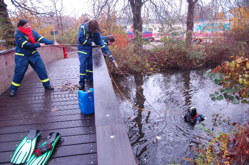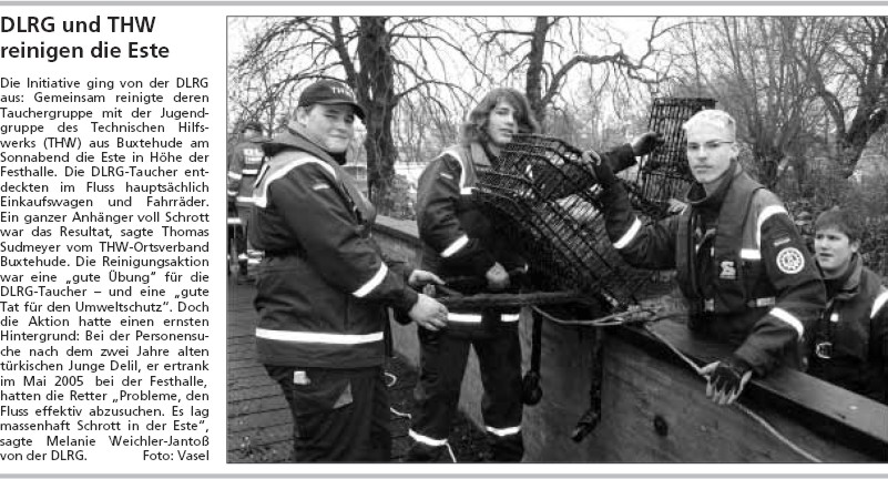 08.11.2008 - Die DLRG Buxtehude hat in diesem Jahr wieder eine Aktion zur Reinigung der Este gestartet. Im Bereich der Este von der Bahn bis zur Poststraße sollte der Müll herausgeholt werden. Am 8. November, gegen 11:00 Uhr startete die Aktion. Mit von der Partie war auch die Jugendgruppe des THW-Ortsverbandes Buxtehude.