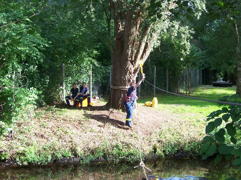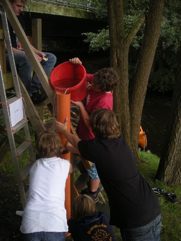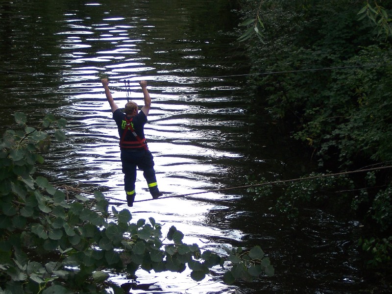 Gesagt, getan. Am Morgen der Veranstaltung rückten ein paar unserer Junghelfer mit der Unterstützung einiger Erwachsener an und bauten eine „Überquerungshilfe“ über die Este. Nach einem kurzen Selbstversuch balancierten die Teilnehmer gut gesichert zum gegenüberliegenden Ufer und zurück. Alle Kids und auch alle Luftballons erreichten ihr Ziel ohne große Probleme. Zum Abschluss durften die teilnehmenden Kids gut gesichert einen Sprung ins kühle Nass wagen. Dieses Angebot wurde natürlich jubelnd angenommen.