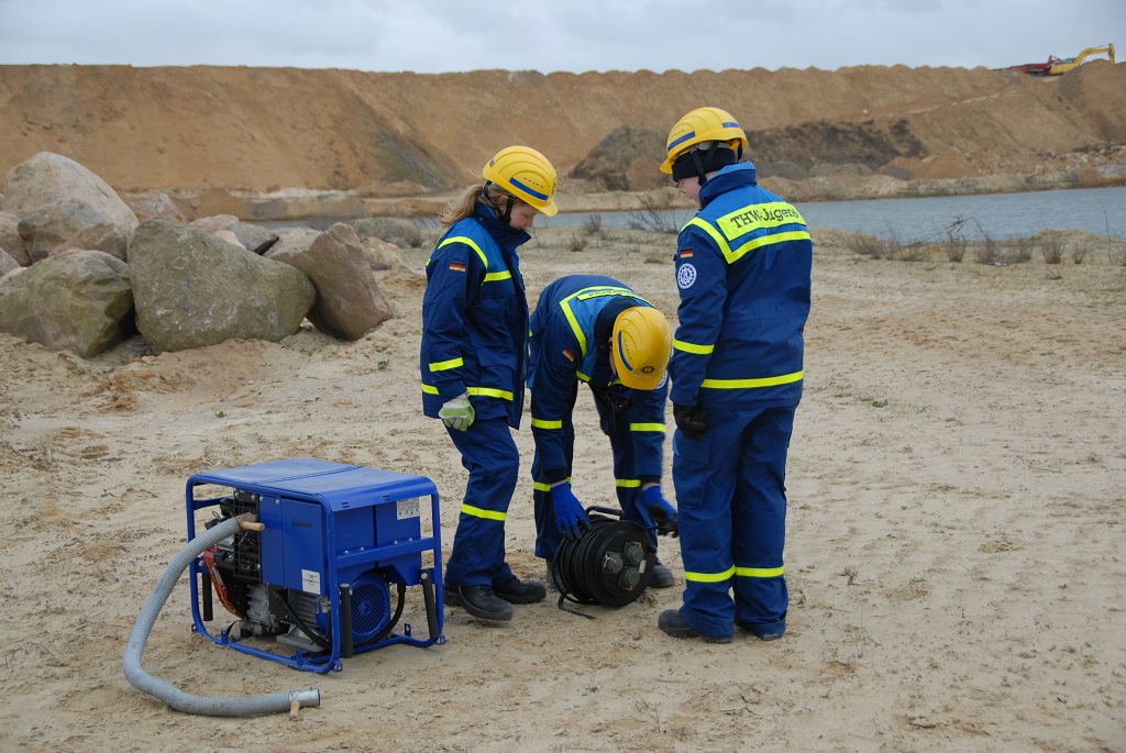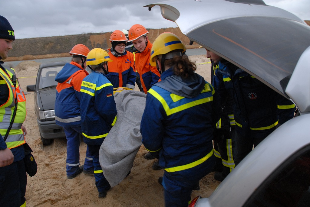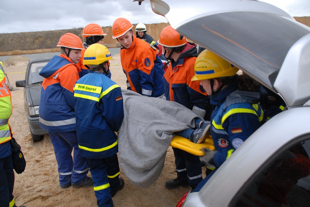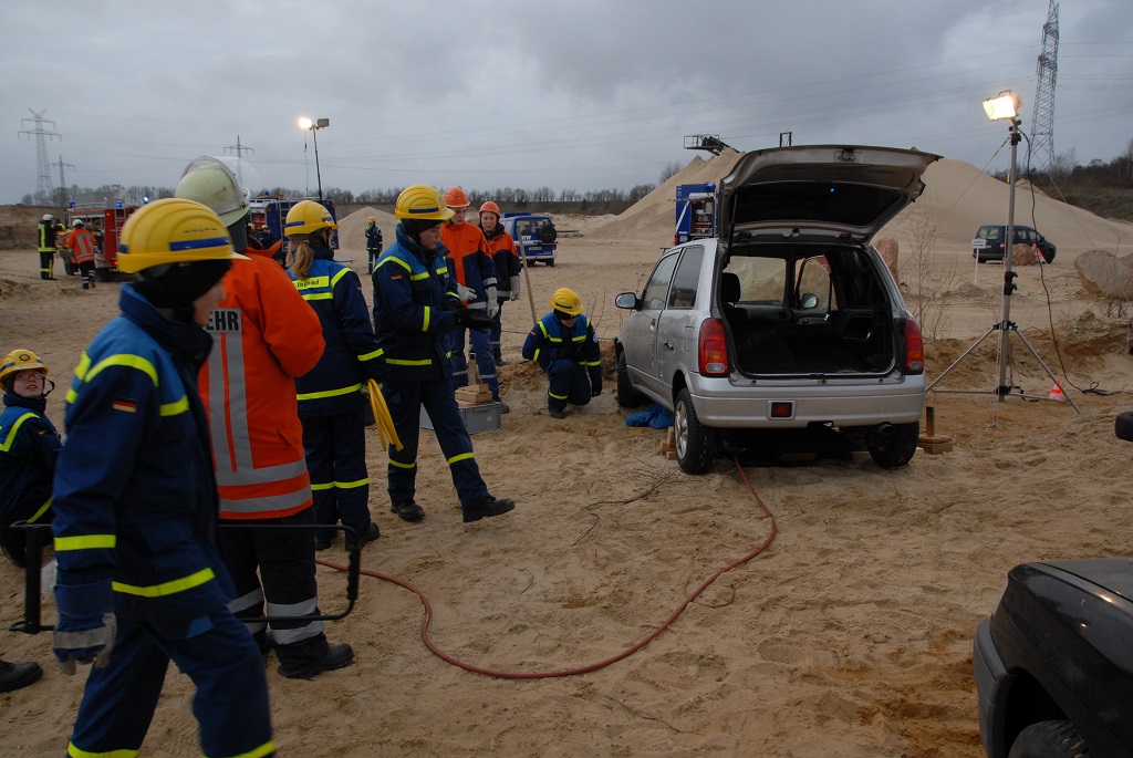 Die Aufgaben, die den Jugendlichen gestellt wurden, waren vielfältig und beschäftigten jeden der Anwesenden. So mussten aus zwei verunglückten Autos verletzte Personen gerettet werden. Hierbei kam so einiges an Geräten zum Einsatz. Mit einem Greifzug wurde das hintere Auto vom vorderen weggezogen, um so an eine der Personen zu gelangen. Auch die Hebekissen fanden Verwendung, als eines der Autos angehoben werden musste, um eine darunter befindliche Person zu retten. Da es im Laufe des Dienstes langsam dunkler wurde, durften die Kids einmal zeigen, was sie beim Aufbau der Beleuchtung schon alles gelernt haben.