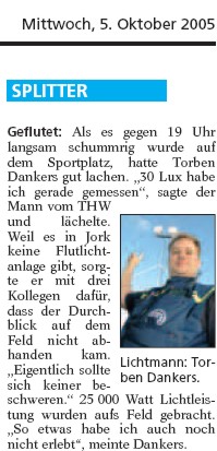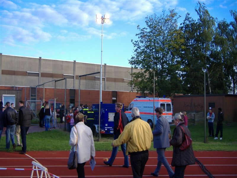 Da der Sportplatz am Schulzentrum in Jork über keine Flutlichtanlage verfügt, wurde das THW gebeten, das Spiel auszuleuchten. Mit 4 Kameraden haben wir für das benötigte Licht gesorgt. Darüber hinaus wurde auch das V.I.P.-Zelt mit Strom versorgt!
