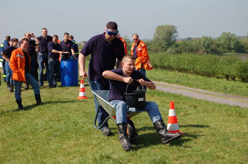 Die Mannschaften mussten Wasser über eine Slalomstrecke transportieren. Eine Person saß mit einem Wassereimer in einer Schubkarre, eine andere Person musste diese um Verkehrsleitkegel herum schieben. Die besondere Schwierigkeit dabei: der oder die Schiebende hatte eine absolut undurchsichtige Brille auf und wurde vom „Wasserträger“ in der Schubkarre per Zuruf dirigiert. Punkte gab es für die transportierte Wassermenge. Zu Punktabzug führten umgefahrene Verkehrsleitkegel oder Abkürzungen. Bei dem strahlendem Sonnenschein am Sonntag war es „feuchtfröhlicher“ Spaß.