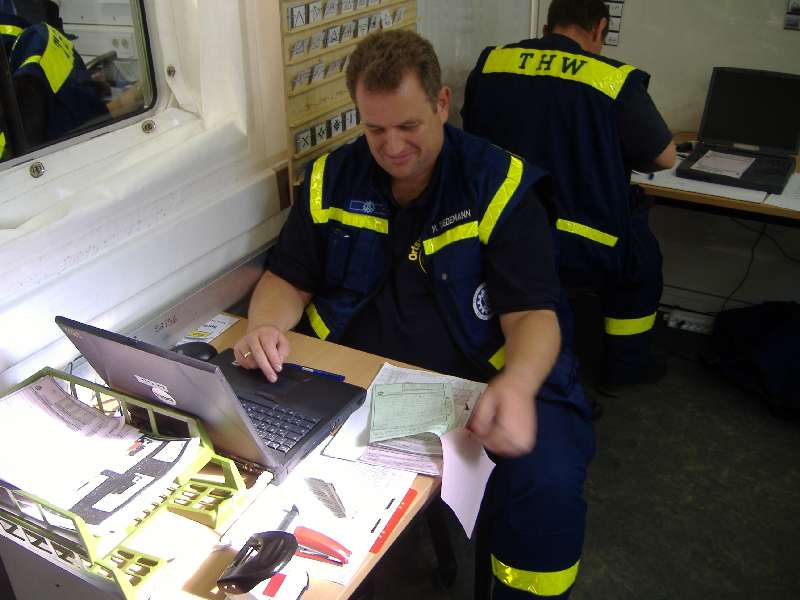 Mit vor Ort waren: . Unser Zugführer Michael Marx als Sachgebietsleiter S3 –Einsatzplanung, Martin Tiedemann als Sichter und Einsatztagebuchschreiber sowie die Helfer Uwe Schröter und Julian Pape, die im Fernmeldebereich der Fachgruppe FK eingesetzt waren.