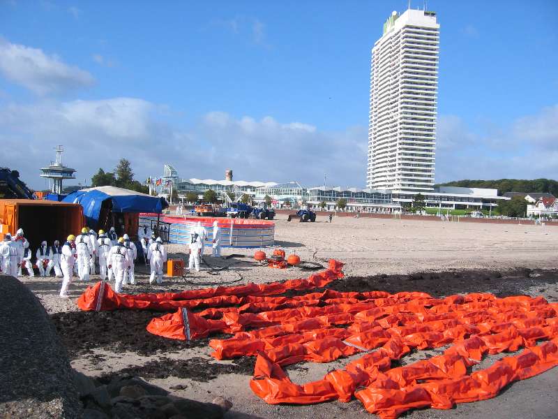 14.-16.09.2007 - Nach einer Schiffskollision in der Kadettrinne treiben 10.000 Tonnen Schweröl auf die Deutsche Ostseeküste zu. Besonders betroffen ist das Gebiet der Lübecker Bucht und der Priwall. Das THW zieht im Auftrag des Havariekommandos alle verfügbaren Kräfte zur Ölschadensbekämpfung in Lübeck zusammen.