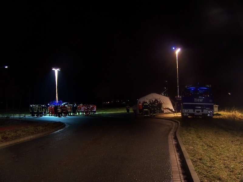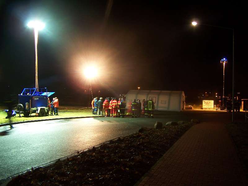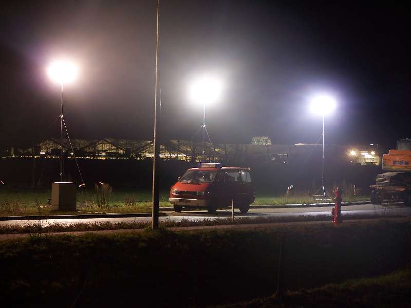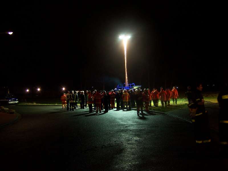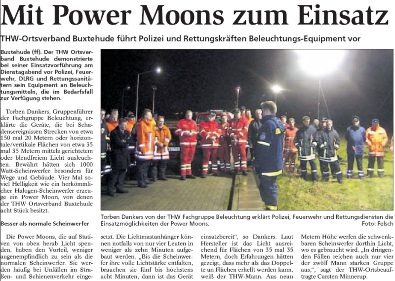 26.02.2008 - „Mit Power Moons zum Einsatz“, war Überschrift im Buxtehuder Tageblatt. Am 26. Februar 2008 um kurz nach 19:00 Uhr wurde es in der Felix-Wankel-Straße im Buxtehuder Gewerbegebiet Ostmoor taghell. Der THW-Ortsverband Buxtehude präsentierte die Leistungsfähigkeit der Fachgruppe Beleuchtung. Zu dieser Veranstaltung waren 30 Gäste aus den Feuerwehren, Rettungsorganisationen und von Politik und Verwaltung eingeladen. Das Interesse war jedoch so groß, dass letztendlich 52 Personen an der Veranstaltung teilgenommen haben.