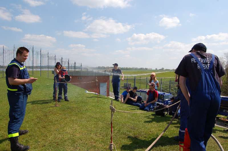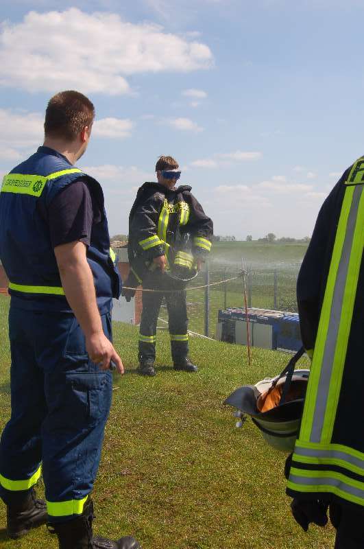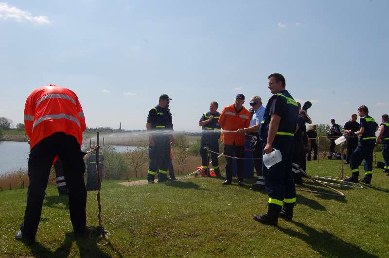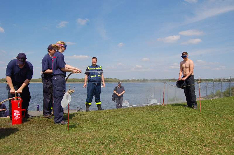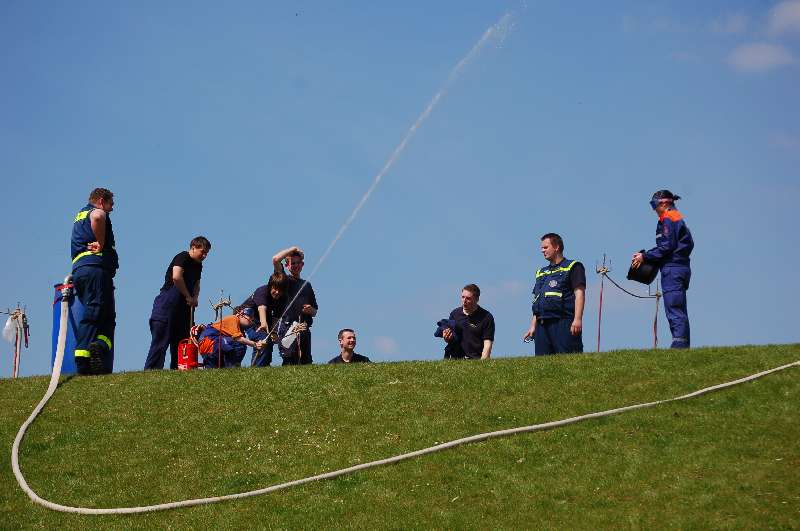 Der THW-Ortsverband Buxtehude hatte auch in diesem Jahr seine Wettkampfstation auf dem Deich in Jork-Borstel aufgebaut. Für die 120 Feuerwehrmanschaften war es wieder ein feuchtes Vergnügen. Bei strahlendem Sonnenschein ging es darum, Wasser mittels einer Kübelspritze über eine Distanz von mehreren Metern in einen Eimer zu befördern. Handycap dabei war, dass sowohl die Frau, bzw. der Mann an der Spritze und der Eimerhalter nichts sehen konnten. Je nach aufgefangener Menge gab es Punkte.