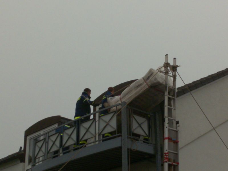 Das Sofa wurde an eine liegende Leiter angebunden und die Leiter wurde zusammen mit dem Sofa aufgerichtet. Die Aktion war ein voller Erfolg. Das Team hat super zusammen gearbeitet. Die beiden neuen Helfer, die erst vergangene Woche ihre Grundausbildung abgeschlossen hatten, konnten an dem Leiterhebel ausgebildet werden. Dieses Projekt zu verwirklichen hat jede Menge Spaß gemacht und wir wünschen der Besitzerin viel Freude an ihrer neuen Couch.