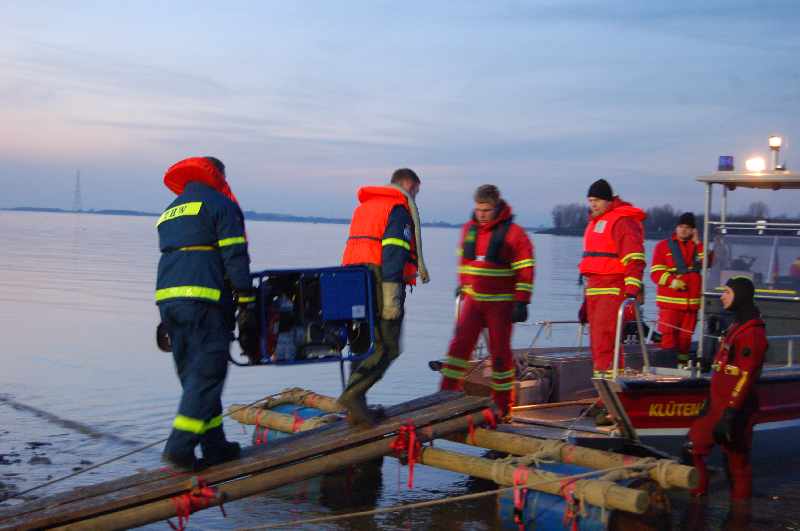 In der Zwischenzeit hatten THW-Helfer der beiden Bergungsgruppen einen Tonnensteg am Elbufer gebaut, damit die Boote der DLRG besser anlanden konnten. Material für einen weiteren Tonnensteg wurde zur Insel gebracht um auch dort eine bessere Landestelle zu schaffen.
