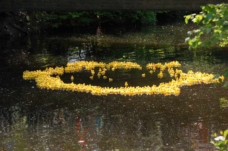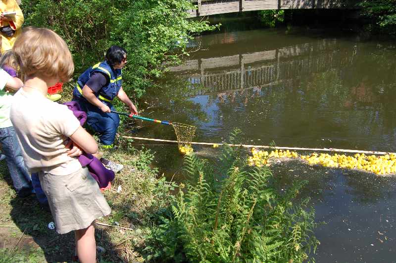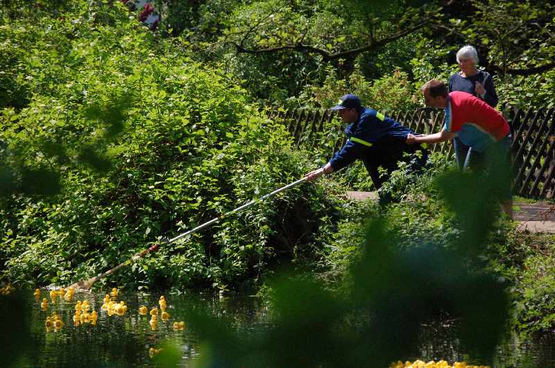 Aber nicht nur mit den Vorbereitungen des Rennens und dem Start der Enten waren unsere Helfer beschäftigt. Sie hatten auch genug damit zu tun, die von Strömung und Wind in das Ufergrün getriebenen Enten wieder auf die Rennstrecke zu bringen. Weitere Herausforderungen waren die im Ziel angekommenen Enten in der richtigen Reihenfolge aus dem Wasser zu ziehen und einen ganzen Trupp Enten, die über das Ziel hinausgeschossen sind wieder einzufangen.