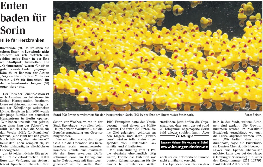 01.05.2009 - Unter dem Titel „Zeig ein Herz für Sorin“ veranstaltete der Verein „Hilfe für Rumänien“ am 1. Mai ein Entenrennen auf der Este in Buxtehude. Der Erlös dieser Aktion soll dem schwer herzkranken Sorin aus Rumänien eine dringend notwendige Operation ermöglichen. Der THW-Ortsverband Buxtehude unterstützte die Aktion.