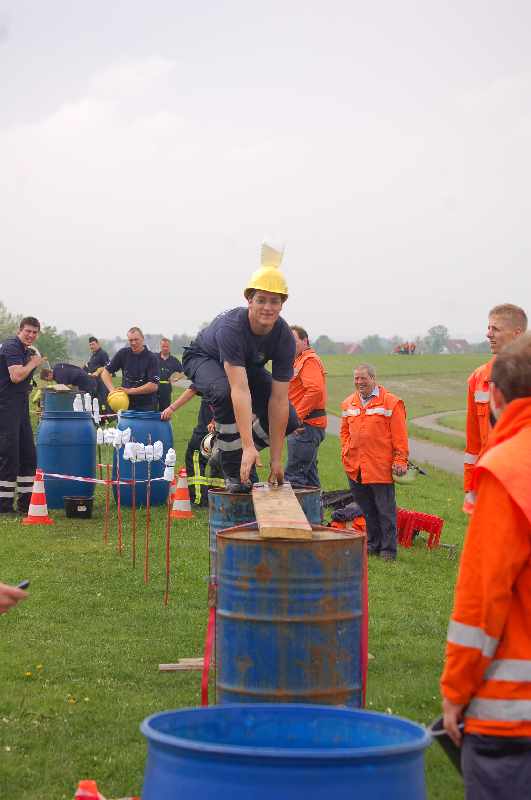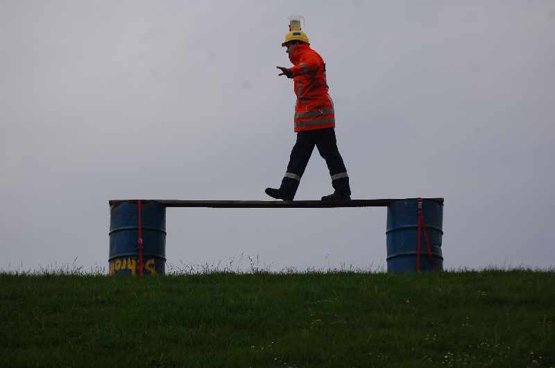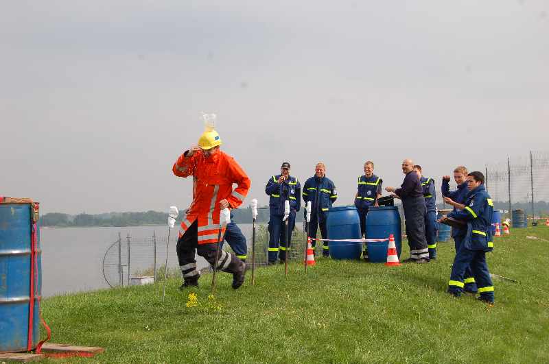 An der schon traditionellen Stelle auf dem Deich, direkt am Zaun von Hahnöfersand, haben unsere Helfer die Wettkampfbahn aufgebaut. Die Kameraden haben auch in diesem Jahr wieder Phantasie bei der Aufgabenstellung walten lassen. Sie stellten die Feuerwehrleute wieder vor eine feuchtfröhliche Aufgabe. Diesmal galt es, eine möglichst große Wassermenge über den Parcours zu transportieren. Die Schwierigkeit dabei: das Wasser musste in einem auf dem Helm festgeschraubten Gefäß auf dem Kopf transportiert werden. Wohl dem, der wasserfeste Kleidung hatte.