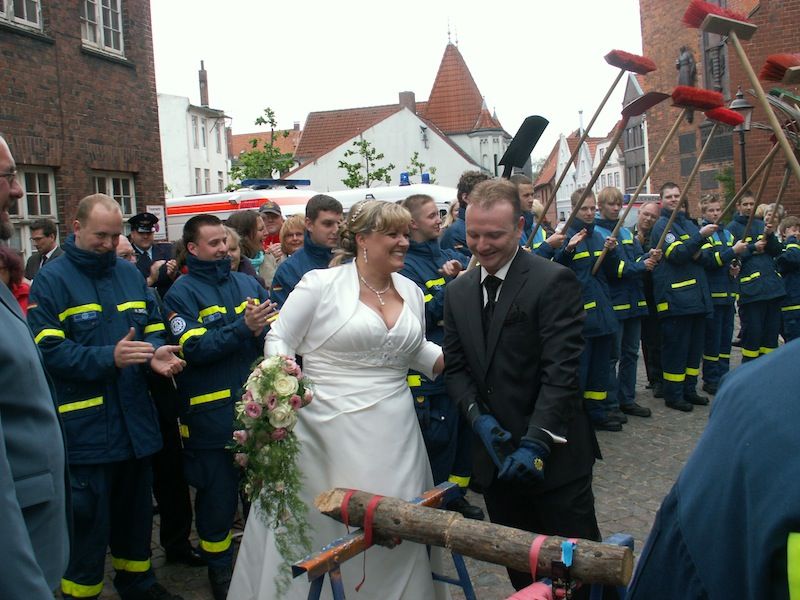 Dann war es endlich soweit, beide haben sich in der St. Petri Kirche im Herzen von Buxtehude ihren kirchlichen Segen geben lassen. Natürlich haben wir es uns nicht nehmen lassen und haben das Brautpaar in Blau empfangen. Nicht nur die Braut wurde mit unserem Einsatzleitwagen (ELW) zur Kirche gebracht, sondern auch nach der Trauung stand unser Ortsverband vor der Kirche Spalier. Nachdem der frisch gebackene Ehemann das erste Hindernis (ein Rundholz) aus dem Weg geschafft hatte, ging es zusammen mit Freunden und Bekannten zur anschließenden Feier.