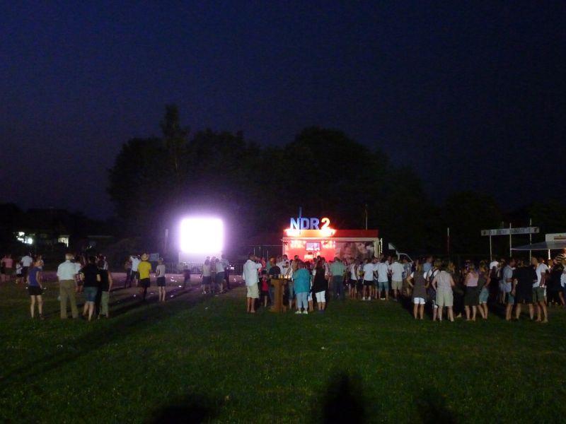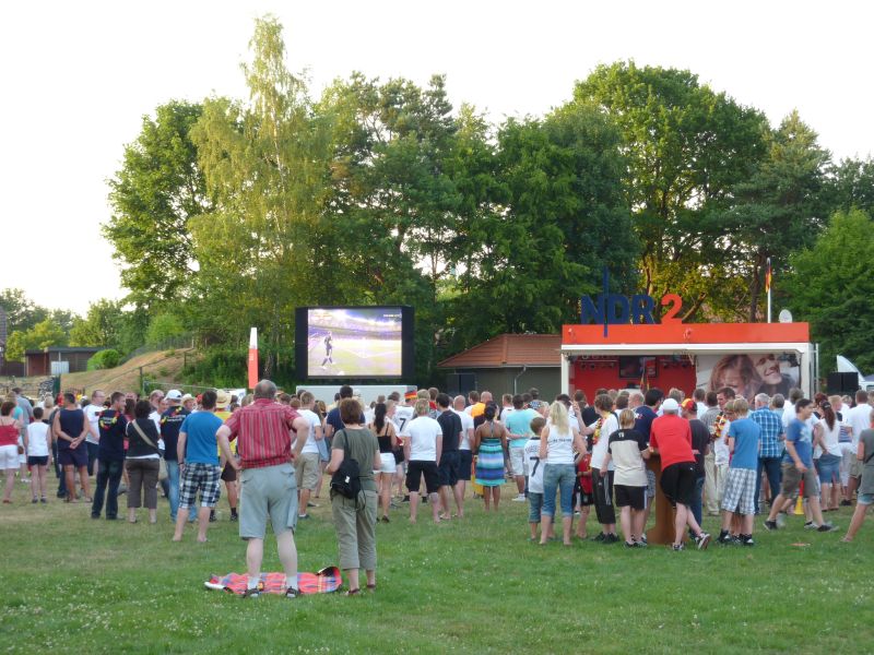 stl_wm6.jpg10.07.2010 - Unter dem Motto „ Die größte Fankurve des Nordens“ verloste NDR 2 ein Event der besonderen Art. Mit dem wahrscheinlich größten Fernseher des Nordens und dem NDR 2 Show Truck übertrugen sie die Spiele der deutschen Nationalmannschaft von der Fußballweltmeisterschaft in Südafrika. Für das letzte Spiel unserer Elf um Platz 3 machte der TUS „Eiche“ Bargstedt das Rennen und setzte sich gegen mehrere Bewerber durch.