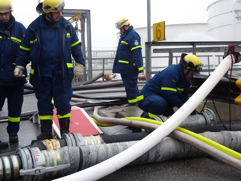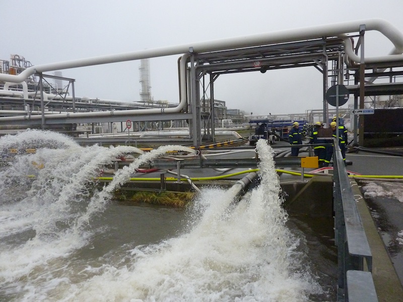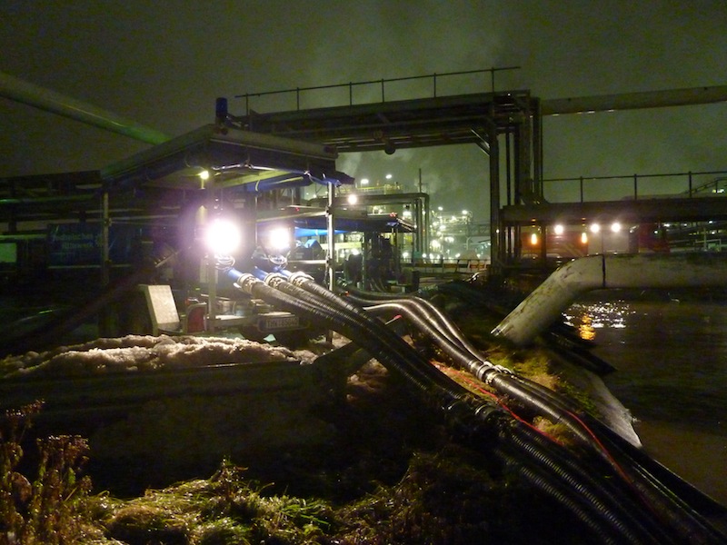 In der Nacht von Mittwoch auf Donnerstag kam es auf dem Werksgelände der DOW in Stade - Bützfleth zu einem teilausfall der Kühlwasseransaugpumpen, die kaltes Frischwasser aus der Elbe in den Kühlkreislauf des Chemieparks pumpen. Zur Überbrückung der Reparaturarbeiten wurde die THW Fachgruppe Wasserschaden/ Pumpen (WP) des Ortsverbandes Stade durch den zuständige Einsatzleiter der Werkfeuerwehr alarmiert. Kurz nach Mitternacht traf die 2. Bergungsgruppe (B2) aus Buxtehude mit ihrem 50 kVA Aggregat und die Fachgruppe WP mit ihrer 15.000 Liter Hochleistungspumpe bei der DOW ein. Nach kurzer Einschätzung der Lage wurde die DIA Pumpe am Kühlwassergraben aufgebaut und in Betrieb genommen. Da die Kapazität der eingesetzten Pumpe nicht ausreichte, wurden durch die THW Geschäftsstelle Buxtehude vier weitere Fachgruppen WP alarmiert. Einheiten aus den Ortsverbänden Bremen-Nord und Ost, Fallingbostel/Walsrode und Hamburg-Bergedorf bauten Ihre Pumpen bis in die späten Abendstunden auf. Insgesamt wurden 65.000 Liter pro Minute in den Kühlkreislauf der Chemieanlagen gefördert. Nachdem am Freitagnachmittag Havariepumpen aus Holland eintrafen und in Betrieb genommen wurden endete der Einsatz für die insgesamt 58 Helferinnen und Helfer des THWs, die im Schichtbetrieb arbeiteten, mit dem Rückbau der THW-Pumpen und der Wiederherstellung der Einsatzbereitschaft in den Ortsverbänden. „Die Zusammenarbeit der einzelnen Gruppen und der Werkfeuerwehr lief hervorragend. Man kenne sich schon von vergangenen Einsätzen und Fortbildungen“ sagte Andre Royke Gruppenführer der Fachgruppe WP aus Stade.