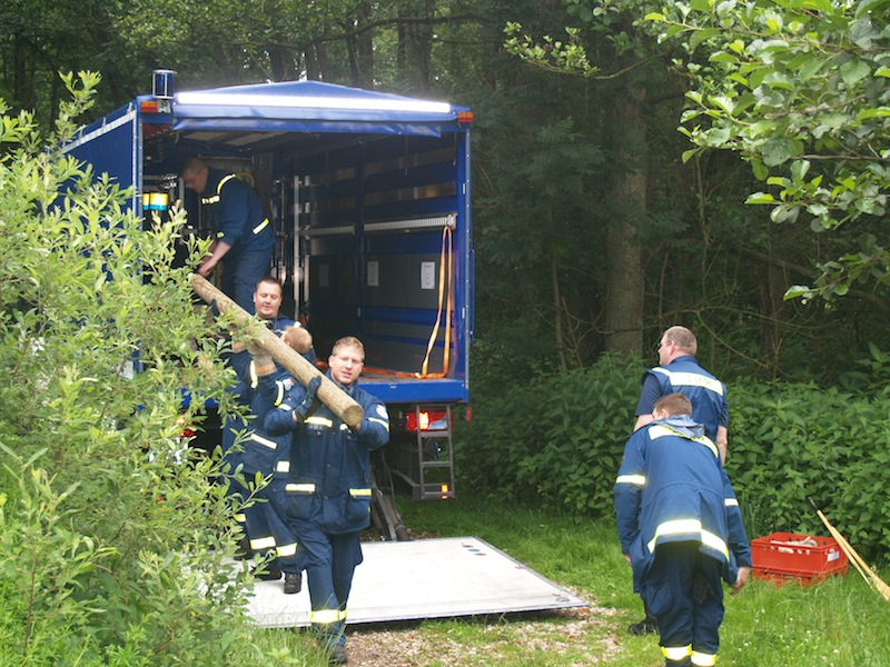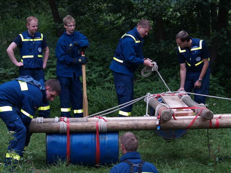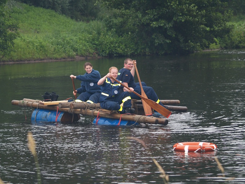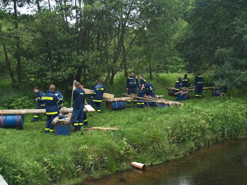 Am frühen morgen wurden die für die Flöße benötigten Baumaterialen wie Rundhölzer, mehrere Bretttafeln und diverse Fässer in den MzKW geladen. Kurz darauf ging es nach Heimbruch zur Este. Nachdem die einzelnen Gruppen für die Flöße feststanden wurde mit deren Bau mittels Stiche und Bunde begonnen. Als alle Flöße zu Wasser gelassen und auf den Weg geschickt wurden, fuhren die Kraftfahrer mit dem Fahrzeugen zum Buxtehuder Mühlenteich um dort auf die Ankunft der Helfer zu warten und den Grill fürs gemeinsame Mittagessen vorzubereiten. Ein Floß schaffte es leider nicht ganz bis um zum Ziel da einige der Tonnen nicht mehr ganz so dicht waren und während der fahrt langsam mit Wasser voll liefen.