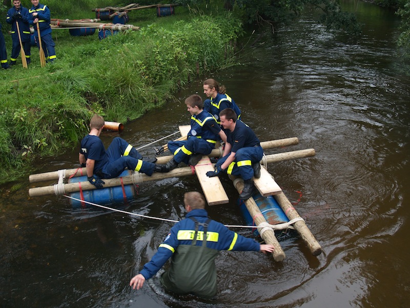 02.07.2011 - Einmal im Jahr fahren die beiden Bergungsgruppen zusammen mit der Fachgruppe Beleuchtung zur Este um dort mit selbst gebauten Flößen zurück nach Buxtehude zu fahren. Der eine oder andere Helfer kam dabei nicht mehr ganz so trocken an.