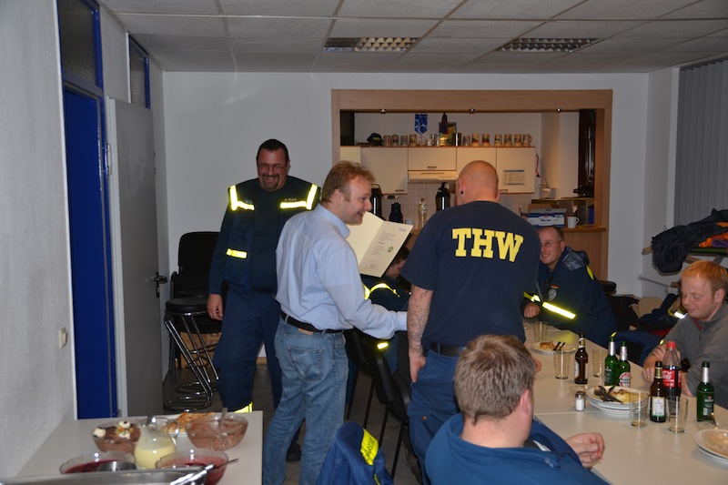 Beim gemeinsamen Abendessen überreichte Der Ortsbeauftrgte Carsten Minnerup dem Gruppenführer der 2. Bergungsgruppe Marc Sierck das Helferabzeichen in Gold mit Kranz. Danach ließen alle gemeinsam den Abend gemütlich ausklinken.