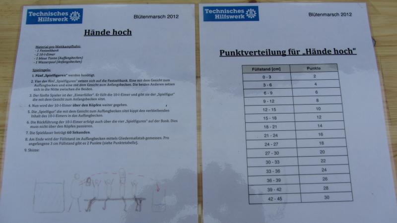 06.05.2012 – Beim 33. Blütenmarsch in Jork ging es bei Station 7 wieder sehr feucht zu. „Hände hoch!“, hieß es beim THW. Es musste Wasser über den Köpfen von vier Personen von einem Becken in das Andere transportiert werden. Bei bedecktem Wetter verließ der ein oder andere die Station nicht ganz so trocken.