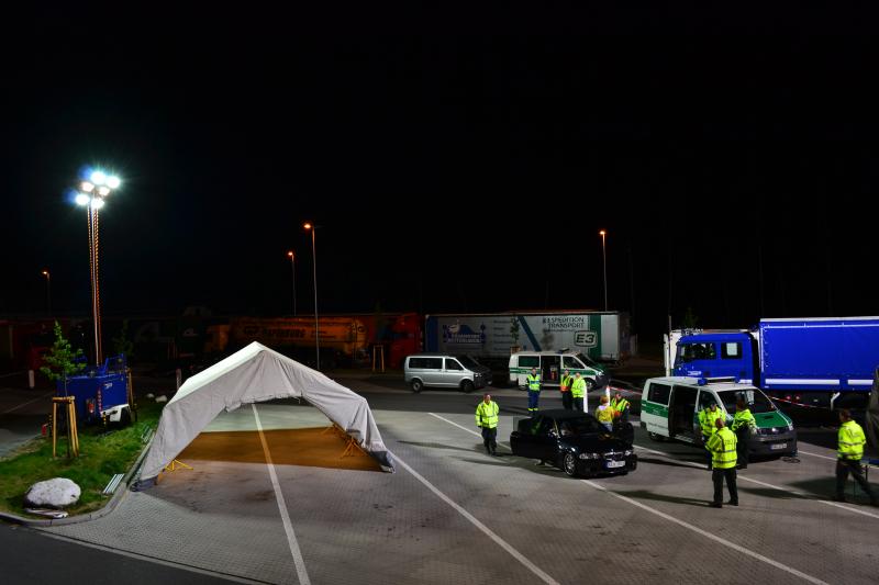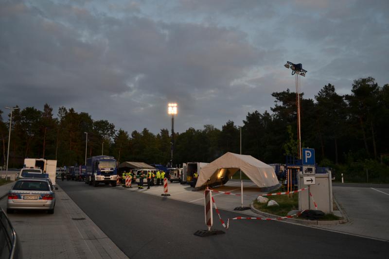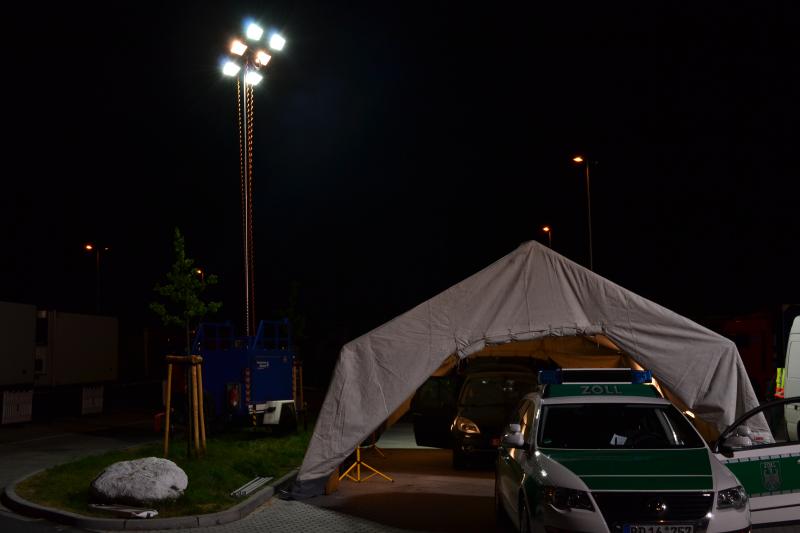 14.06.2012 - In der Nacht von Donnerstag auf Freitag führte das Hauptzollamt Hamburg-Hafen eine groß angelegte Kontrolle auf der A1 auf Höhe der Raststätte Aarbachkate durch. Das THW stellte zur Unterstützung des Zolls mehrere Zelte zur Durchsuchung der Fahrzeuge und Personen sowie die nötige Ausleuchtung des Parkplatzes durch den Lichtmast der Fachgruppe Beleuchtung sicher.