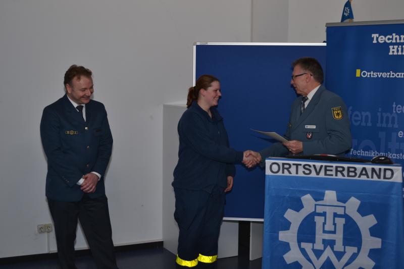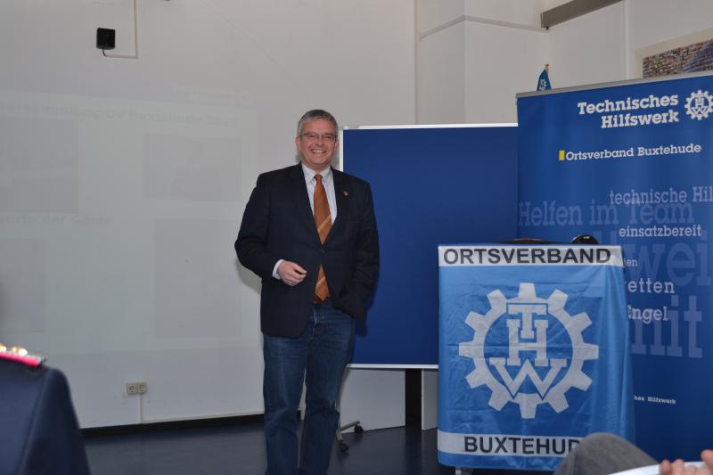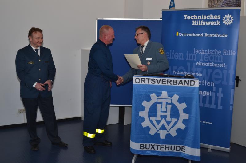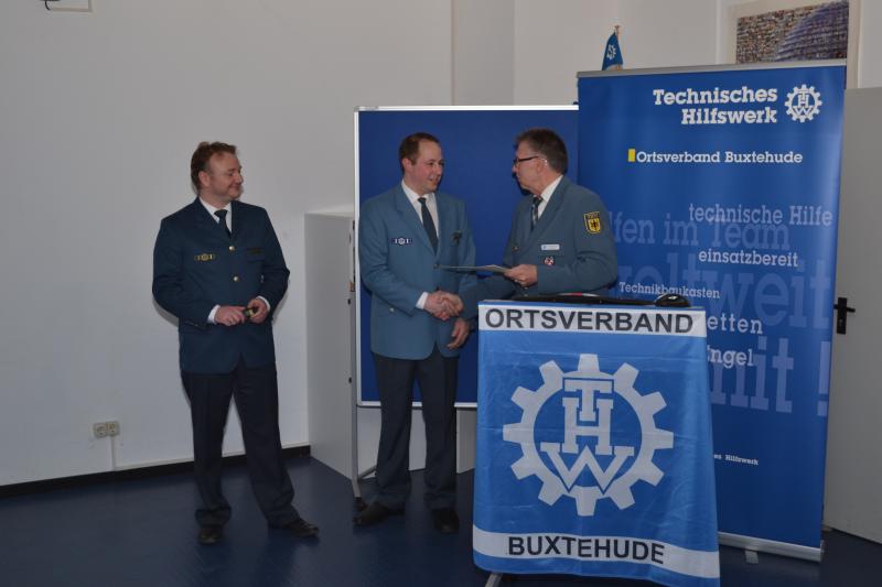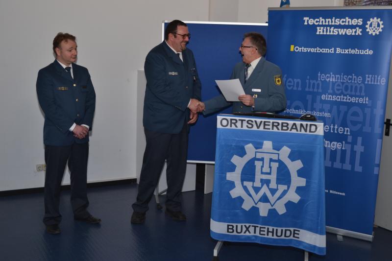 Nicht nur der Veranstaltungsraum war bis auf den letzten Platz durch die zahlreichen Gäste aus Politik, Verwaltung, zahlreichen Hilfsorganisationen und den Helferinnen und Helfern des Ortsverbandes gut gefüllt - auch die Liste mit den Punkten auf der Tagesordnung war voll. So wurde Carsten Minnerup für weitere fünf Jahre als Ortsbeauftragter ernannt. Ebenso wurden Birger Thomßen als Schirrmeister und Tanja Schröder als Jugendgruppenbetreuerin durch den Geschäftsführer der Geschäftsstelle Buxtehude, Gerd Schlebusch, ernannt. Michael Marx trat als Zugführer zurück und wird in Zukunft dem Ortsverband als Fachberater zur Verfügung stehen. Als neuer Zugführer wurde Christian Gröpper ernannt. Dieser war bis 2004 schon einmal Zugführer, trat damals aber aus beruflichen Gründen zurück. Bei der Mitgliederzahl des Ortsverbandes konnte Carsten Minnerup nur positives Berichten. So sank die Zahl der Mitglieder nur leicht um sechs Helfern und Jugendlichen auf 142. Im Durchschnitt hatte der einzelne Helfer an rund 149 Stunden bei Aus- und Weiterbildungen, Übungen und sonstigen Veranstaltungen teilgenommen.