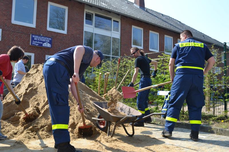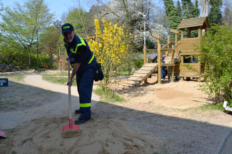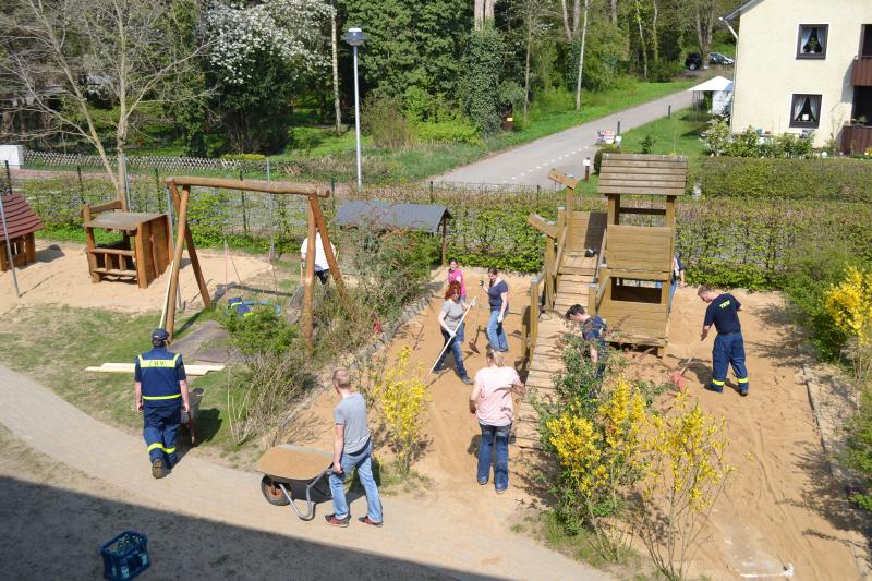Im Laufe der Jahre verunreinigte der Sand rund um die Spielgeräte und in den Sandkisten, in denen die Kleinkinder unter der Woche täglich spielen und umher toben. Der Grad der Verunreinigung nahm in der letzten Zeit durch Wettereinflüsse und frei laufenden Tieren der Art zu, sodass sich die Kindergartenleitung dazu entschloss, einen kompletten Austausch des Sandes vorzunehmen. Ein Unternehmen wurde bereits im Voraus damit beauftragt, den alten Sand abzutragen. Nun mussten nur noch die frischen 51 Tonnen des neuen Spielsandes von einem angrenzenden Parkplatz mit Hilfe von Schubkarren auf dem Außengelände verteilt werden. Hierfür wandten sich die Eltern an uns und baten uns um Hilfe. Carsten Minnerup, Ortsbeauftragter, überlegte nicht lange und schickte die Helfer am Samstagvormittag zur Unterstützung in die Bebelstraße. 15 Helfer vom THW und 17 Eltern verteilten Sand in 90 Minuten rund um die Spielgeräte. „Wir sind den Jungs vom THW sehr Dankbar für die Unterstützung. Ohne Euch hätten wir dafür bis in die Abendstunden gearbeitet.“ – so Erzieherin Petra Schönfelder.