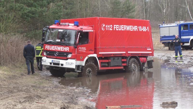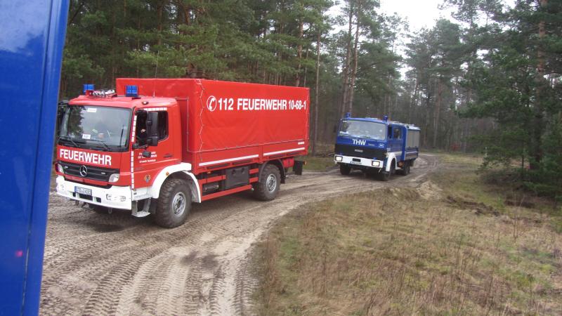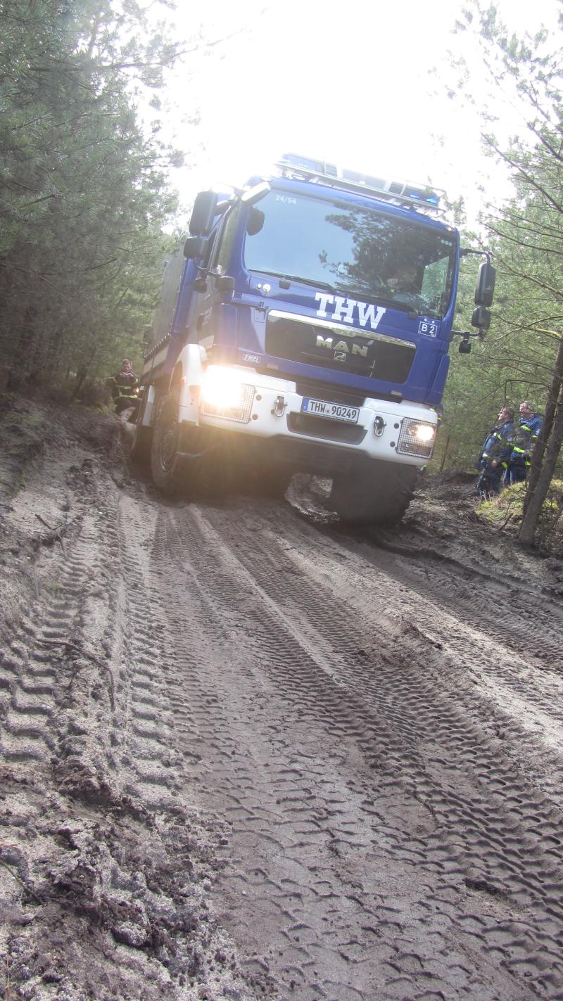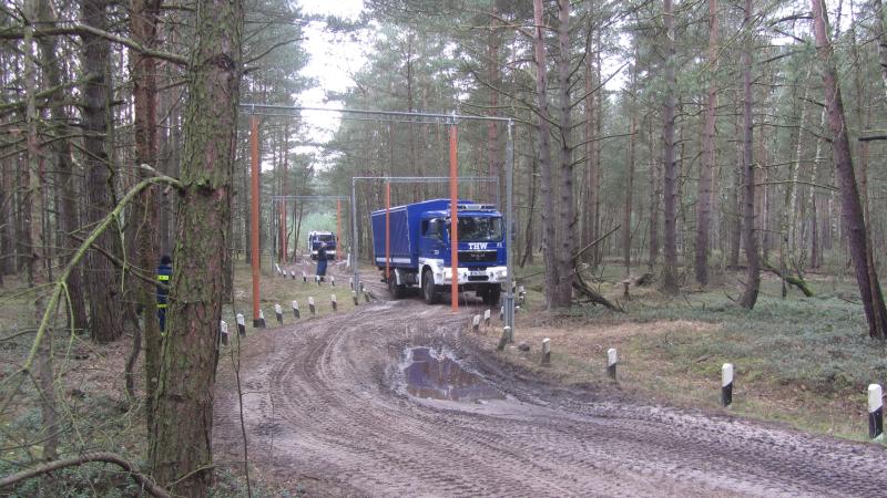 Geröllstrecke, Knüppeldamm, Wellenbahn und Stangenwald. Diese Begriffe kannte man vorher nur von Geschicklichkeitswettbewerben für Allrad-LKW. Doch nun sollten die LKWs vom Technischen Hilfswerk und der Feuerwehr sicher durch die Strecken geführt werden. Vor dem Durchfahren der einzelnen Ausbildungsstationen wurden die Fahrer durch unseren Zugführer Christian Gröpper geschult, z.B. wann die Längs- und Differentialsperren zugeschaltet werden oder in welchem Gang gefahren wird. Im Nachgang wurde das Verhalten der Fahrzeuge geprobt. Auch die Helferinnen und Helfer, die keinen LKW-Führerschein besitzen, wurden mit einbezogen. Denn im Ernstfall muss der LKW bei schlechter Sicht des Fahrers durch einen Helfer, der vor dem Fahrzeug steht, durch schwierige Passagen dirigiert werden können.