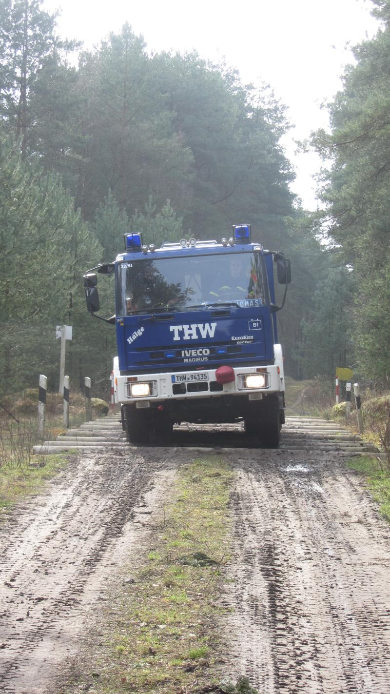 Morgens um halb sieben Uhr machte sich unser Technischer Zug sowie drei Kameraden des Zug I mit ihren Gerätewagen Logistik aus Buxtehude auf den Weg zum 85 Kilometer entfernten Truppenübungsplatz der Bundeswehr in Bergen. Ziel auf dem weitreichenden Areal war die Kraftfahrzeuglehrbahn. Wo sonst im Normalbetrieb Soldaten mit ihren schweren Fahrzeugen ausgebildet werden, konnten nun unsere Kraftfahrer sehen, wie sich unsere Lastkraftwagen (LKW) in bestimmten geländebedingten Situationen verhalten.