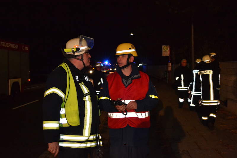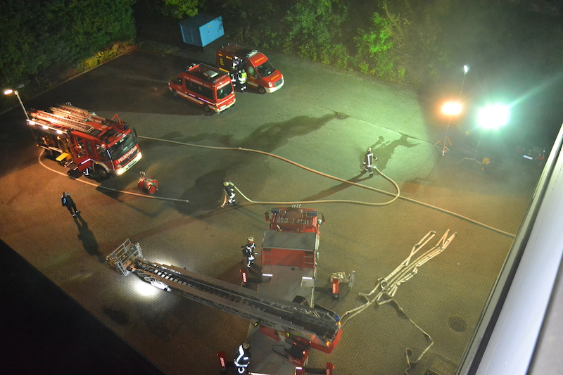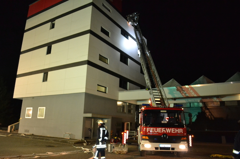 Kurz nachdem Eintreffen der ersten Einsatzkräfte drang die Feuerwehr unter schwerem Atemschutz in das stark verrauchte Bürogebäude ein, da sich im Keller sowie in den oberen Etagen des Gebäudes noch Menschen befinden sollten. Zusätzlich wurde außen am Gebäude die Drehleiter in Postion gebracht um so die Personen vom Dach zu retten. Das Deutsche Rote Kreuz richtetet währenddessen eine Verletztensammelstelle ein wo die geretteten Personen auf Verletzungen untersucht wurden und für den weiteren Transport in die umliegenden Krankenhäuser vorbereitet wurden.