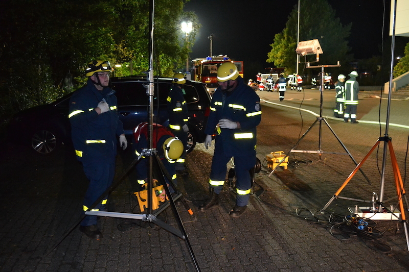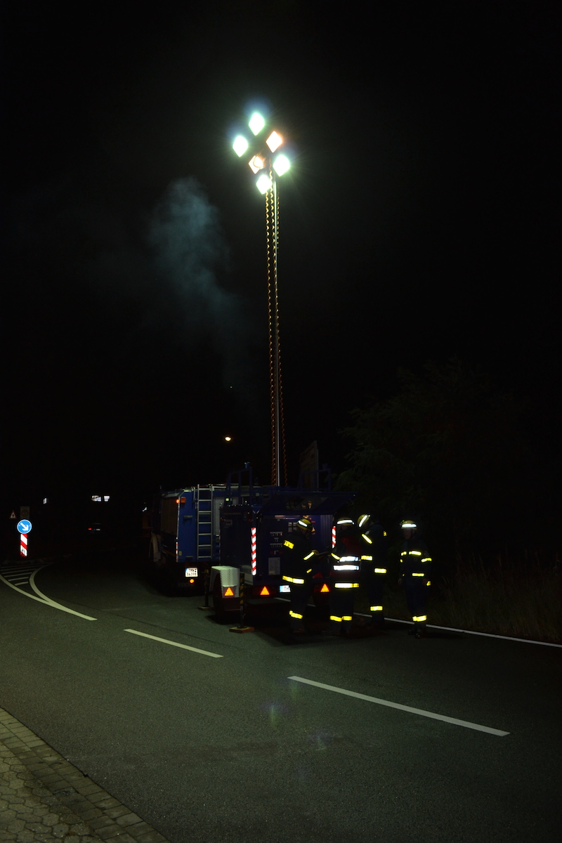 Die Fachgruppe Beleuchtung des THWs baute ihren Lichtmastanhänger auf, sodass die Einsatzstelle komplett ausgeleuchtet wurde und die Einsatzkräfte sicherer arbeiten konnten. Zudem wurden an einzelnen Punkten des Geländes mehrere HQI Scheinwerfer zur weiteren Ausleuchtung aufgestellt.