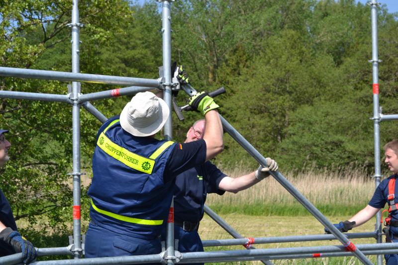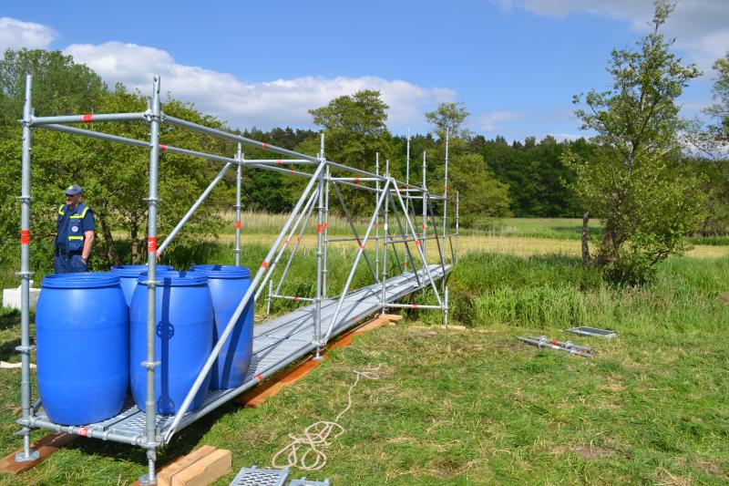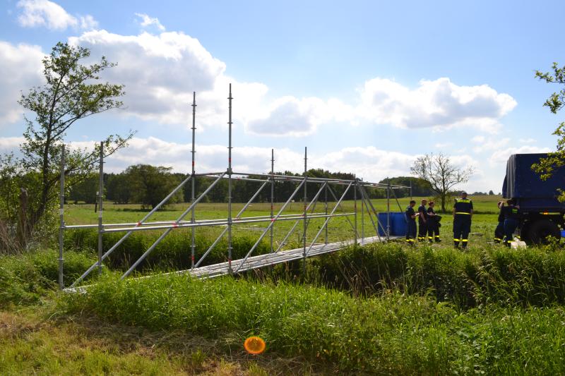 Im kleinen Ort Nindorf, vor den Toren von Buxtehude, bauten unsere Helfer/innen eine knapp fünf Meter lange Fußgängerbrücke über die Este. Hierbei kam das vielseitige EGS zum Einsatz. Der Ortsverband wäre in der Lage, auch eine Brücke mit einer Länge von neun Metern zu bauen. Nach Fertigstellung der Brücke holte sich dann der ein oder andere seine Abkühlung in der Este. Einige freiwillig - andere eher weniger.