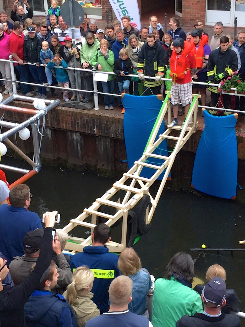 Alle zwei Jahre veranstaltet die Hochschule 21 aus Buxtehude für die Studierenden das Sommerbrückenfest. Vor den Augen einer Professoren Jury und mehreren hundert Besuchern testeten die Erbauer ihre Brücken selber auf ihre Tragfähigkeit. Damit den Teilnehmern nichts passierte sicherten Helfern der DLRG, Feuerwehr, Johanniter Unfallhilfe und dem THW aus Buxtehude die Enden der Brücken ab.