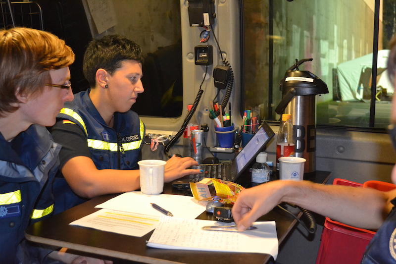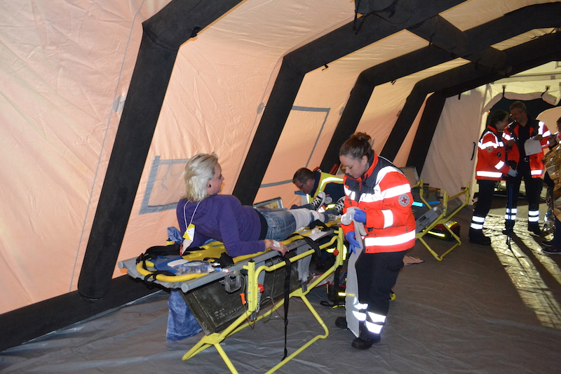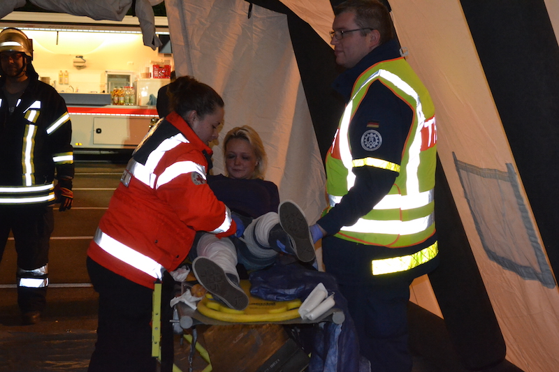 Die Bahnerdungsgruppe der FFW Horneburg sorgte zunächst dafür, dass die beiden Züge nicht mehr unter Strom standen und somit keine Gefahr mehr für die eingesetzten Rettungskräfte bestand. Erst jetzt konnten die Verletzten aus den Zügen gerettet werden und zum Behandlungsplatz des DRKs gebracht werden. Hier hatten die THW-Kräfte aus Buxtehude mit ihrem Lichtmastanhänger und Notstromaggregat den Behandlungsplatz taghell ausgeleuchtet. Zusätzlich wurden die Zelte des DRKs mit Strom versorgt, in denen die Verletzten von Ärzten und Rettungssanitätern für den weiteren Transport in umliegende Krankenhäuser behandelt wurden. Hier unterstütze ein durch das DRK ausgebildeter Sanitätshelfer vom THW bei der Sichtung der Verletzten. Ein weiterer Einsatzauftrag für das THW Buxtehude war es, bei der Einsatzleitung des DRKs mit dem Zugtruppfahrzeug zu unterstützen und Helferinnen und Helfern für die Führung dieser Übung einzusetzen.