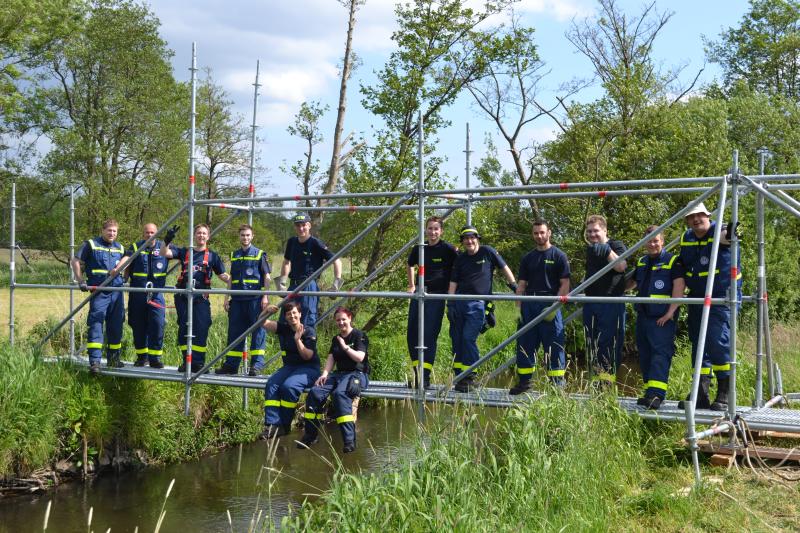 06.06.15 – Nachdem das Hochdruckgebiet „Xenia“ uns in den letzten Tagen die ersten heißen Sommertage bescherte, ging es für unsere Helfer/innen auf dem Juni-Dienst an die Este, wo der ein oder andere sich eine Abkühlung abholen konnte. Aber auch die Ausbildung kam nicht zu kurz. Mit Hilfe des Einsatz-Gerüstsystems (EGS) wurde eine kleine Brücke über die Este gebaut.