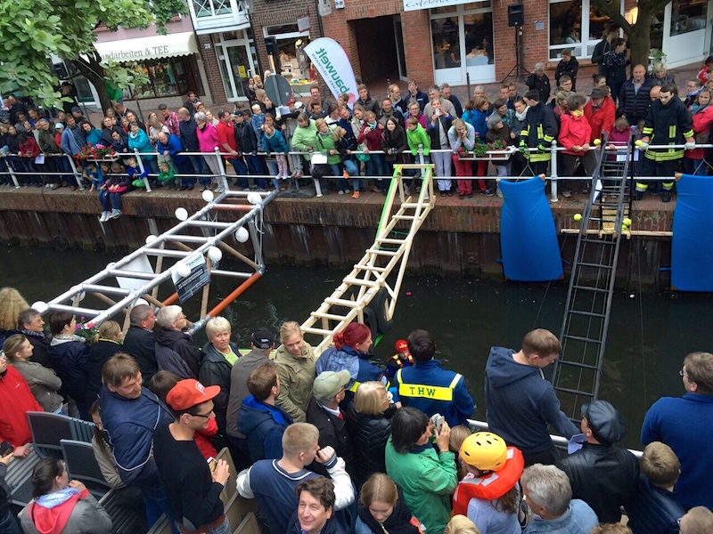 20.06.2015 - Am vergangenen Samstag veranstaltete die Hochschule 21 wieder das Sommerbrücken Fest in der Buxtehuder Altstadt. Angehende Bauingenieure und Architekten entwerfen eigens konstruierte Brücken aus Bauschaum, Pappe oder Bambus und testen die Brücken, welche über den Westfleth aufgebaut sind, selber auf Ihre Tragfähigkeit. Zu ihrer Sicherheit waren Helfer von DLRG, Feuerwehr, Johanniter Unfallhilfe und dem Buxtehude THW vor Ort.