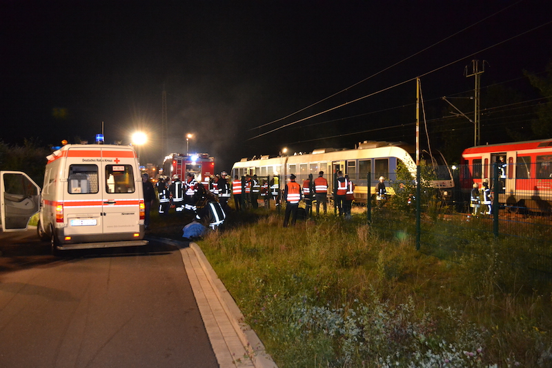 30.08.2015 - Gegen 00:30 Uhr in der Nacht zu Sonntag meldete der Triebwagenführer einer S-Bahn eine Kollision mit einem Triebwagen der EVB kurz hinter dem Buxtehuder Bahnhof. Dabei wurden mehrere Fahrgäste in beiden Zügen verletzt. Die daraufhin durch das Notfallmanagement der Deutschen Bahn ausgelöste Rettungskette alarmierte umgehend die Rettungskräfte von Bundespolizei, Deutschem Roten Kreuz, Feuerwehr und Technischen Hilfswerk.