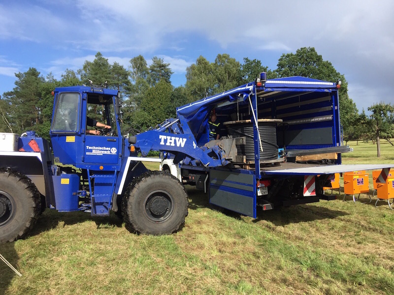 06.09.2015 - Am frühen Sonntagvormittag wurde der Mehrzweckkraftwagen (MzKW) der 2. Bergungsgruppe aus Buxtehude alarmiert, um 3,5 Tonnen Kabel und weiters Elektromaterial nach Celle zu transportieren. Hier wird seit dem Wochenende ein Flüchtlingslager für 500 Menschen errichtet.