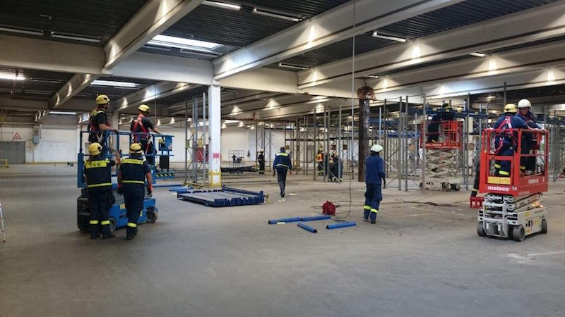 26.09.2015 - In Saarstedt bei Hildesheim wird seit dem vergangenem Wochenende eine neue Unterkunft für Flüchtlinge in einem ehemaligen Großlager eines großen deutschen Discounters errichtet. Gemeinsam mit Kameraden aus dem Ortsverband Stade machten sich acht Helferinnen und Helfer am frühen Samstag Morgen auf dem Weg um bei der Demontage der Regale in dem Lager andere Einheiten von Johanniter, Feuerwehr und Technisches Hilfswerk zu unterstützen.