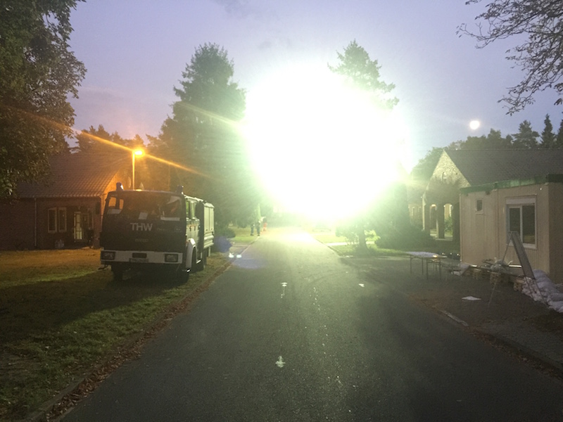 26.09.2015 - Unsere Fachgruppe Beleuchtung fuhr am Samstag nach Lüneburg in die Theodor-Körner-Kaserne um dort eine Notunterkunft für Flüchtlinge für die Abend- und Nachtstunden mit ihrem Lichtmastanhänger sowie weiteren Leuchtmitteln auszuleuchten. Gemeinsam mit Kameraden aus Lüneburg, Kutenholz und Uelzen unterstützten die Helferinnen und Helfer die DLRG, welche von der Landesregierung zum Aufbau und Betrieb der Unterkunft für 500 Flüchtlinge beauftragt wurde.