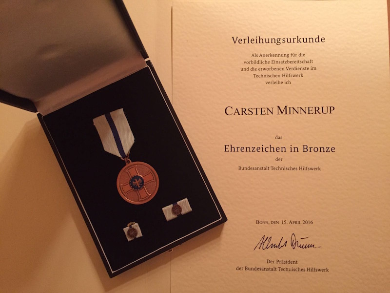 Eine besondere Auszeichnung erhielt Carsten Minnerup, Ortsbeauftragter für Buxtehude. Er wurde mit dem Ehrenabzeichen in Bronze des THW ausgezeichnet. Seit 2003 führt er den Ortsverband Buxtehude durch gute, aber auch herausfordernde Zeiten. So galt es mit dem Wegfall der Wehrpflicht den Ortsverband gemeinsam mit den Führungskräften sowie Helferinnen und Helfern neu auszurichten und für neue Helfer attraktiv zu gestalten. Zudem übernahm Carsten Minnerup im letzten Jahr zusätzlich die kommissarische Führung des THW Ortsverbandes Stade, welcher zum Jahreswechsel an einen neuen Amtskollegen übergeben werden konnte.