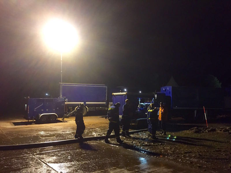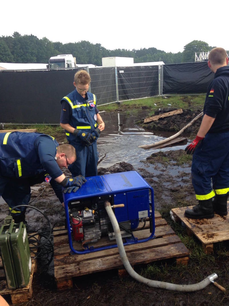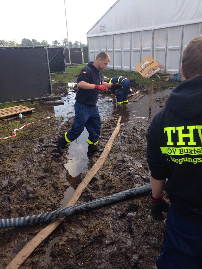 Die Ortsverbände Bremen Nord und Ost rückten mit ihren Hochleistungspumpen und einer Förderleistung von 15.000 und 5.000 Liter pro Minute an. Damit diese Pumpen das Wasser auch ansaugen konnten, wurden durch den Ortsverband Rotenburg und deren Radlader große Löcher ausgehoben, in denen sich das Wasser sammelte und damit schneller abgepumpt werden konnte. Mit einsetzender Dunkelheit wurden auch die Buxtehuder THW-Helfer alarmiert, um die Einsatzstellen auszuleuchten. Sechs Helfer machten sich mit dem Mehrzweckkraftwagen (MzKW) und dem 50 kVA Stromerzeugeraggregat der 2. Bergungsgruppe auf ins 41 Kilometer entfernte Scheeßel. Vor Ort wurden zunächst die Pumpenstellen aus Bremen Nord ausgeleuchtet. Danach wurden kleinere Wasserflächen, die die großen Pumpen nicht absaugen konnten, mit kleinen Tauchpumpen zu den großen Sammelbecken befördert, um so von den großen Pumpen vom Gelände verbannt zu werden.  Immer wieder verlegten die Helfer die Tauchpumpen, um den Backstage-Bereich, aber auch die Bereiche vor den Bühnen sowie Sanitätsbereiche und Fluchtwege trocken zu legen. Am Sonntagmorgen rückten weitere Kräfte der 1. Bergungsgruppe nach, um bei letzten Pumparbeiten und anschließendem Rückbau zu unterstützen. Gegen 11:00 Uhr waren die Plätze wieder soweit trocken, dass die zahlreichen Besucher doch noch in den Genuss kamen, ihre Bands zu sehen. Nicht nur der Veranstalter zeigte sich sehr zufrieden mit der Arbeit der THW-Kräfte, auch die zahlreichen Besucher bedanken sich mit großem Applaus bei unserer Helfen, als sie das Gelände verließen und zurück zur Unterkunft fuhren.