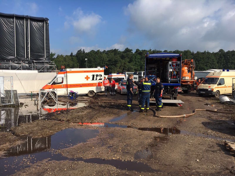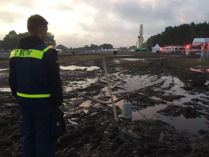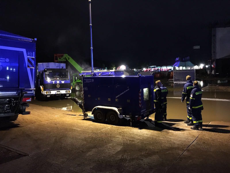 25.06.2016 - Am vergangenen Wochenende feierte das Hurricane-Festival in Scheeßel seinen 20. Geburtstag. Doch anstatt großer Musiker und toller Bühnen-Shows bekamen die fast 75.000 Besucher starke Regenfälle mit Gewittern geboten. Die starken Regenfälle führten dazu, dass große Teile des Veranstaltungsgeländes mehrere Zentimeter unter Wasser standen und Auftritte verschiedener Bands abgesagt werden mussten. Um die Flächen vor den Bühnen und die Rettungswege von den Wassermassen zu befreien, forderte der Veranstalter am späten Samstagabend das THW an. Die Ortsverbände Bremen Nord, Bremen Ost, Rotenburg und Buxtehude pumpten nach der Alarmierung die ganze Nacht durch, damit die verbliebenen Besucher am Sonntag doch noch ein paar Bands sehen konnten.