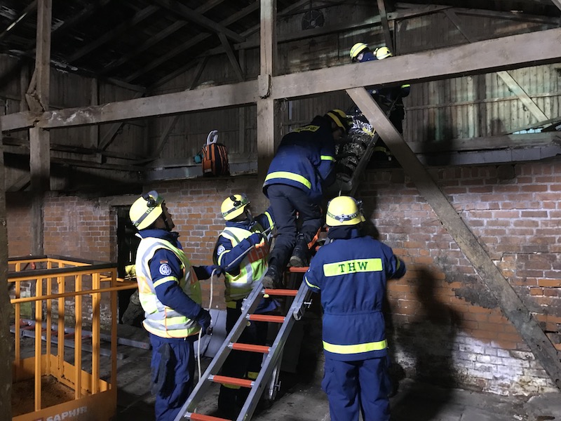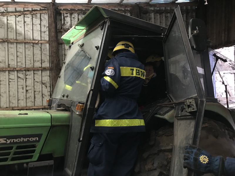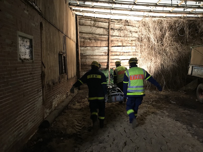 Als erstes Fahrzeug war der Zugtrupp am Einsatzort, um sich einen Überblick über die Lage zu machen und weitere Informationen an die nachrückenden Kräfte weiterzugeben. Einem Anwohner zur Folge waren zum Zeitpunkt der Verpuffung vier Personen in der Scheune anwesend und galten  als vermisst. Da die Eingänge der Scheune durch die Wucht der Verpuffung verschlossen waren, verschafften sich die Helfer/innen mittels Rettungssäge einen Zugang zum Gebäude. Im Inneren wurde dann sofort mit der Suche nach den vermissten Personen begonnen. Die Fachgruppe Beleuchtung hatte unterdessen das Außengelände großflächig ausgeleuchtet und begann nun im Inneren der Scheune für ausreichend Licht zu sorgen. Die erste Person wurde auf einem Zwischenboden gefunden und mit Hilfe einer „schiefen Ebene“ gerettet. Dabei wurde die Person in einen Schleifkorb gelegt und dann über eine schief anliegende Leiter nach unten abgelassen. Eine weitere Person wurde auf einem Anhänger gefunden und zur Verletztensammelstelle nach draußen gebracht. Für eine Person kam leider jede Hilfe zu spät: Sie wurde von einem Steiger-Korb zerquetscht. Die letzte Person saß noch hinter dem Steuer des verunfallten Treckers und wurde durch die Wucht der Explosion eingeklemmt. Hier waren unsere Sanitätshelfer gefordert und mussten die Person mit sehr viel Feingefühl aus der Fahrerkabine heraustransportieren. Nach dem Übungsende kamen alle Führungskräfte zusammen und besprachen gemeinsam mit den Übungsbeobachtern, was noch verbessert werden könnte. Insgesamt waren alle Beteiligten mit dem Ablauf zufrieden, besonders auch im Hinblick auf die sehr kurze Ausrückzeit der ersten Helfer/innen zum Einsatzort. Weitere Punkte werden kurzfristig aufgearbeitet.