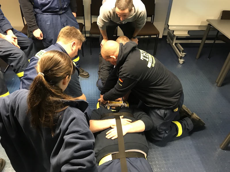 Kurz danach ging es weiter mit einem kleinen Erste Hilfe-Kurs und einer Auffrischung zum Thema „richtiger Umgang mit dem Spineboard, um verletzte Personen schonend und verletzungsfrei zu transportieren“. Ein großes Dankeschön richten wir dabei an die zwei Kameraden der Buxtehuder Feuerwehr Stephan Glinicki und Marcel Strosina – die auch gleichzeitig ausgebildete Rettungssanitäter sind – für ihre tatkräftige Unterstützung. Kurz vor Dienstende wurde das erlernte Wissen vom Tage noch in einer kleinen Übung angewendet. Eine verletzte Person musste unter Atemschutz aus einer Straßenunterführung gerettet und im Anschluss versorgt werden. Der Zugtrupp übernahm während der Übung die Atemschutzüberwachung sowie die Dokumentation des Einsatzes.
