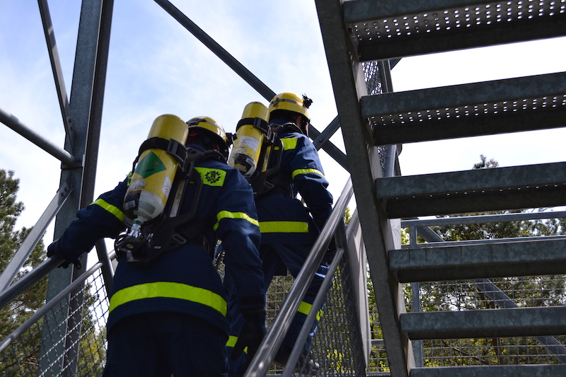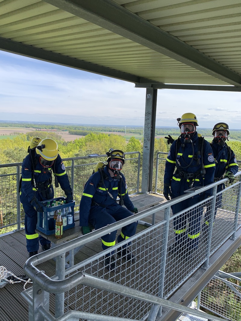 Vier unserer Helfer/innen nutzten gleich die Gelegenheit und bestiegen den Turm mit Atemschutzgeräten. Mit einer Flaschenfüllung schafften sie gleich vier mal hintereinander den Aufstieg.